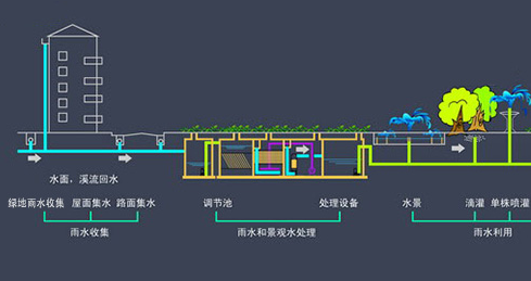 雨水經(jīng)過(guò)收集、凈水再存儲(chǔ)用于綠化、景觀水體、洗滌及地下水源提供雨水補(bǔ)給,以達(dá)到綜合利用雨水資源和節(jié)約用水的目的。